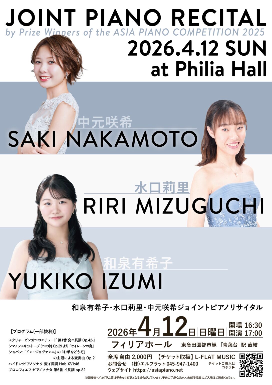 本リサイタルでは2025年8月31日(日)にみなとみらい小ホールにて開催されたアジアピアノコンペティション2025の入賞者3名による演奏が披露されます。