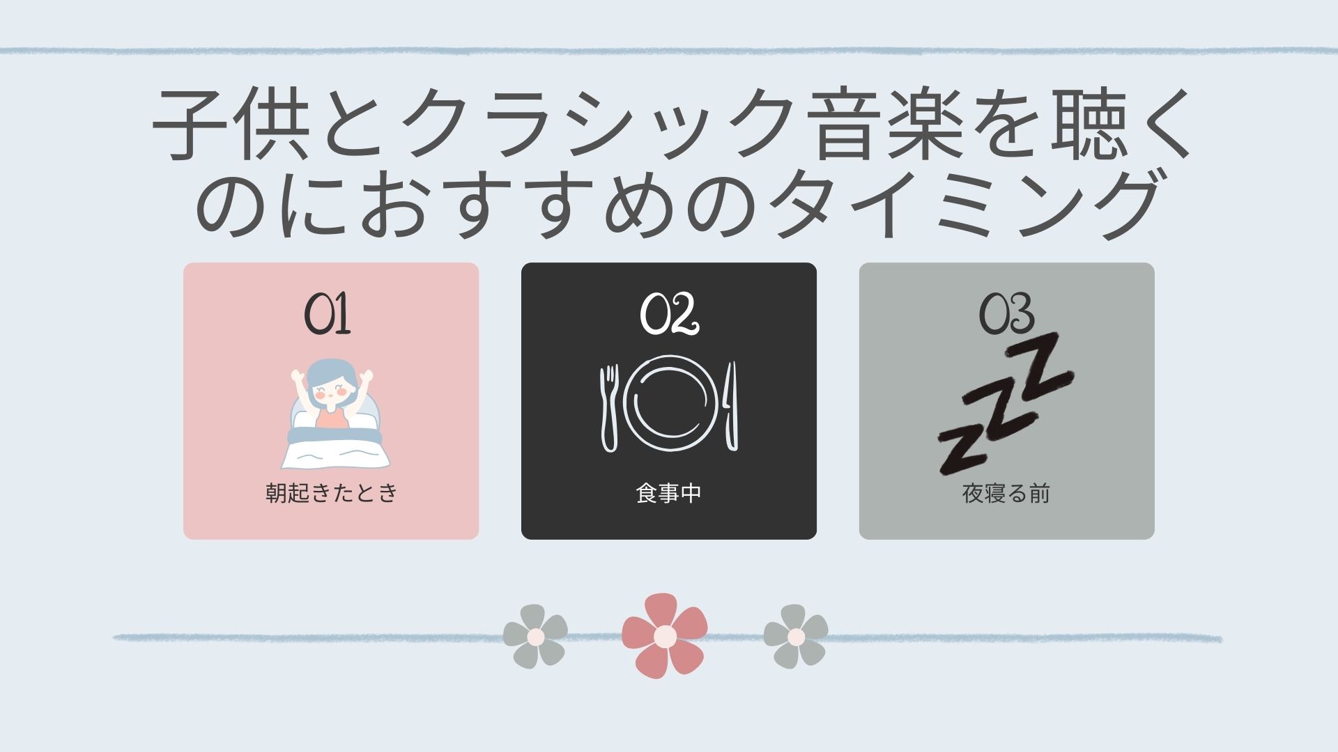 お子様にクラシック音楽を聴かせる際に、日常でクラシック音楽を取り入れるのにおすすめのタイミングをご紹介します!